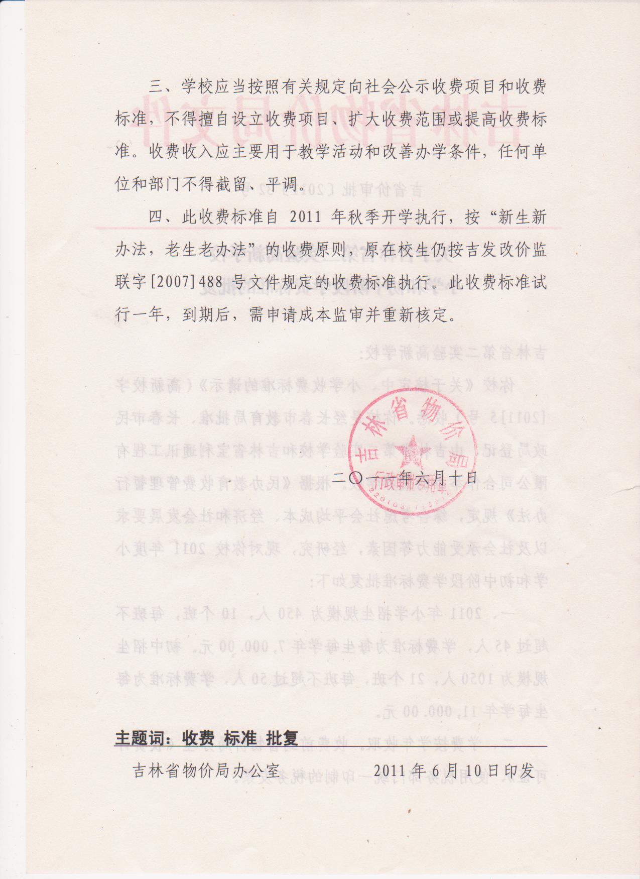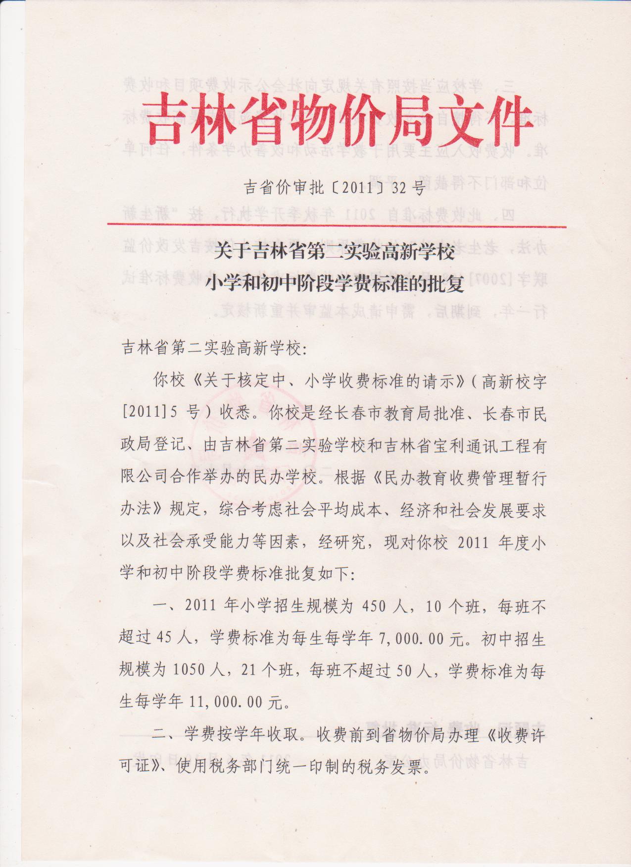 关于吉林省第二实验高新学校小学和初中阶段学费标准的批复
