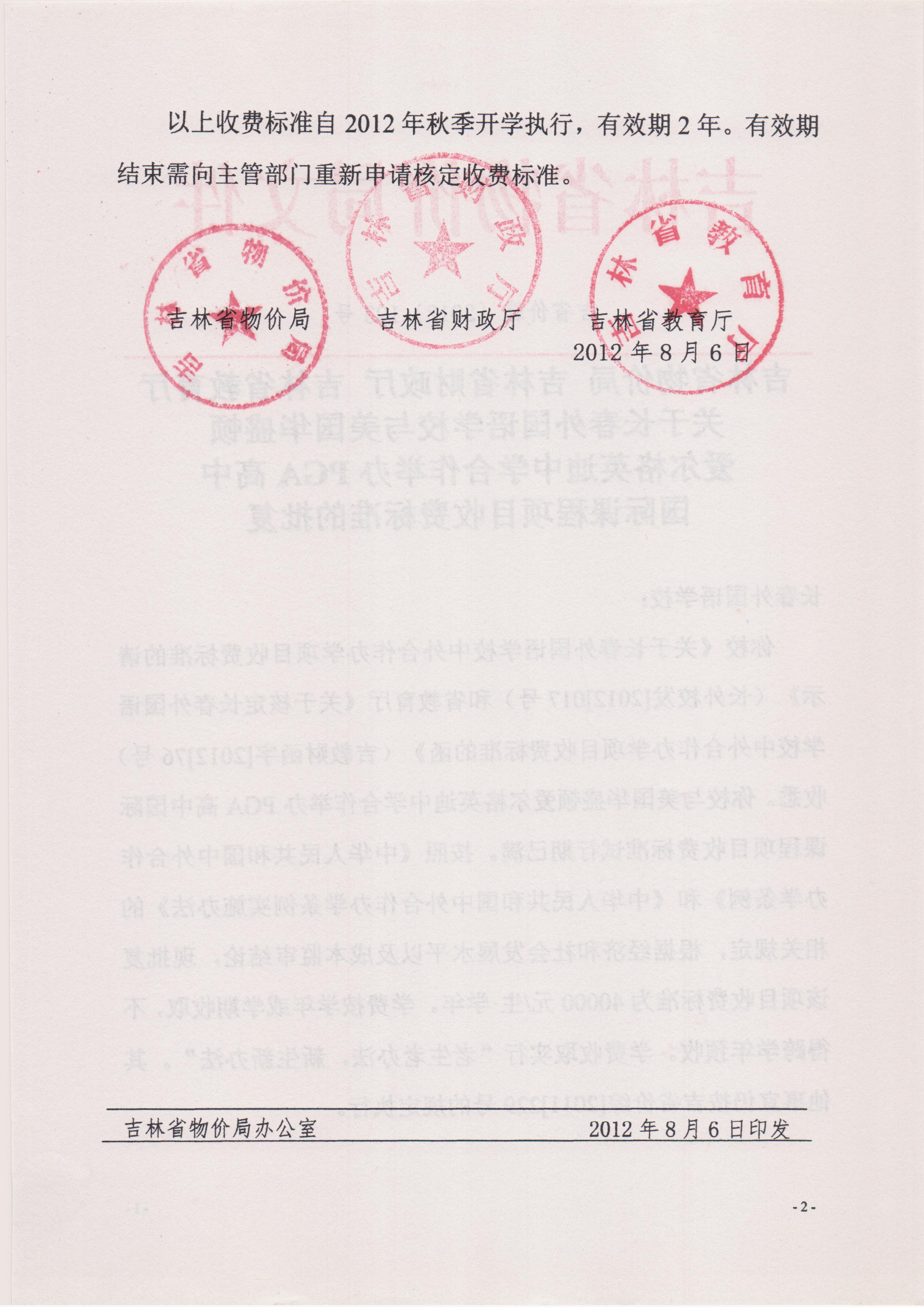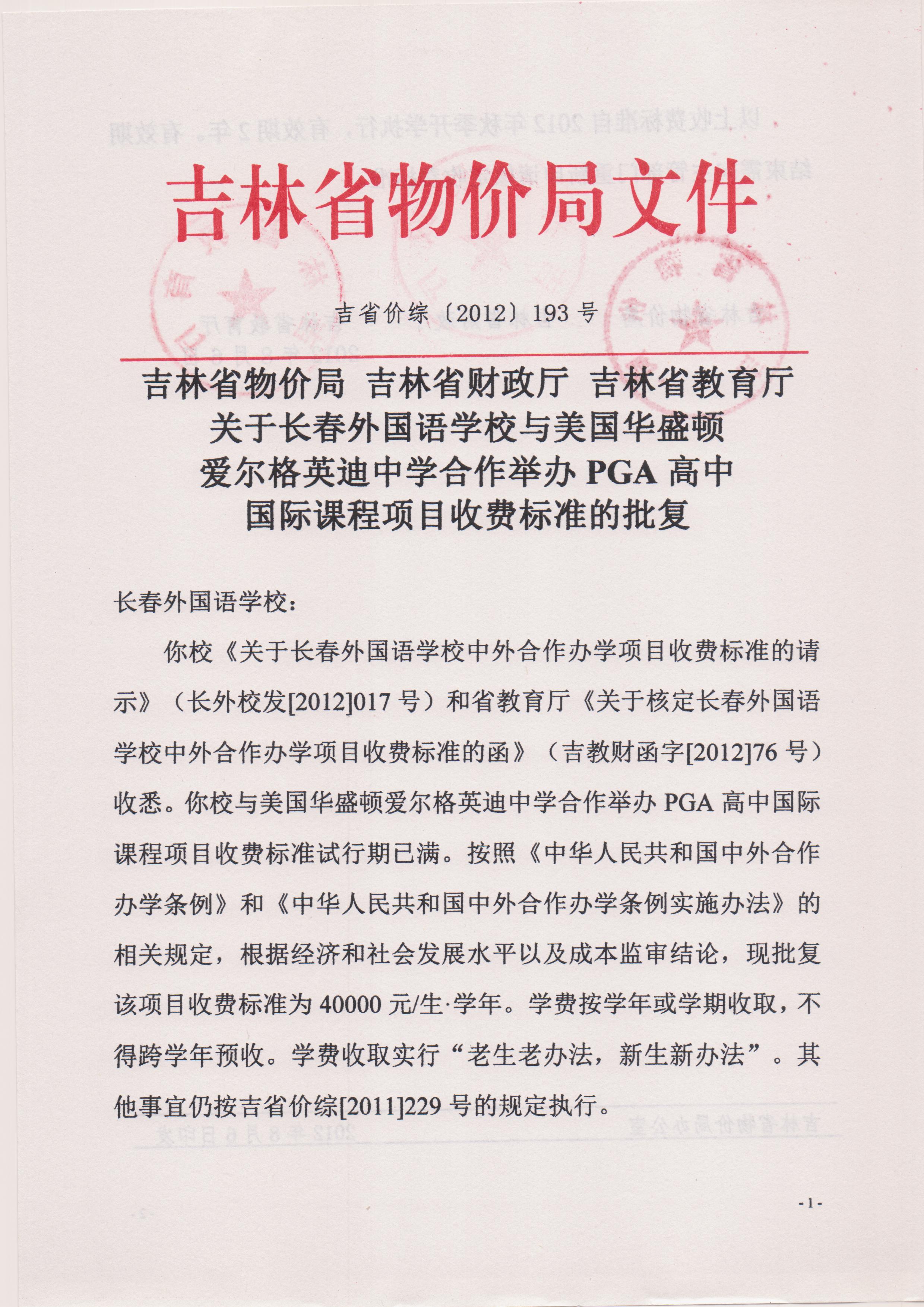 关于长春外国语学校与美国华盛顿爱尔格英迪中学合作举办PGA高中国际课程项目收费标准的批复