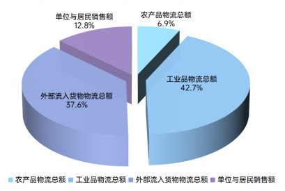 从社会物流结构来看,各类物流总额占比如下:农产品物流总额占比6.9%,工业品物流总额占比42.7%,外部流入货物物流总额占比37.6%,单位与居民物品销售额占比12.8%(再生资源物流总额因数据量级较小未列入)。与去年同期相比,农产品物流和单位与居民物品销售额保持相对稳定,工业品物流总额占比略有下降,而外部流入货物物流明显增加。省内规模以上工业企业增加值同比增长3%,而利润同比下降25.4%,全省工业领域盈利水平有所降低,对工业品物流产生一定影响。全省各类物流总额占比情况见图1-2,全省社会物流总额占比及同期比较见图1-3。