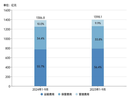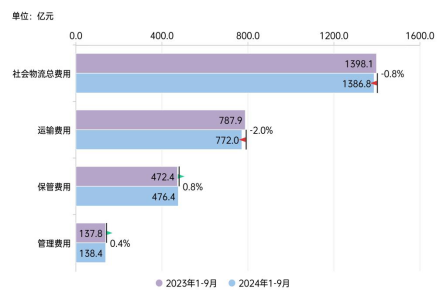 2024年1-9月份,吉林省社会物流总费用达1386.8亿元,同比下降0.8%,社会物流总费用与GDP的比率为13.7%,较去年同期降低0.4个百分点。其中,运输费用772.0亿元,同比下降2.0%;保管费用476.4亿元,同比增长0.8%;管理费用138.4亿元,同比增长0.4%。运输费用下降较为明显,保管费用和管理费用出现小幅度增长,物流成本稳中有降。全省社会物流总费用及分项费用同比增长情况见图 2-1。