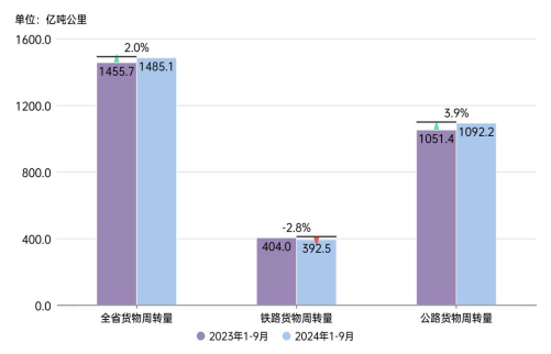 2024年1-9月,吉林省货物周转量完成1485.1亿吨公里,同比增长2%。其中,铁路货物周转量完成392.5亿吨公里,同比下降2.8%;公路货物周转量完成1092.2亿吨公里,同比增长3.9%;航空货物周转量完成0.39亿吨公里,同比增长12.6%。货物周转量、公路货物周转量与航空货物周转量稳健增长,铁路货物周转量小幅下滑。全省铁路、公路与总体货物周转量增长情况见图3-2。