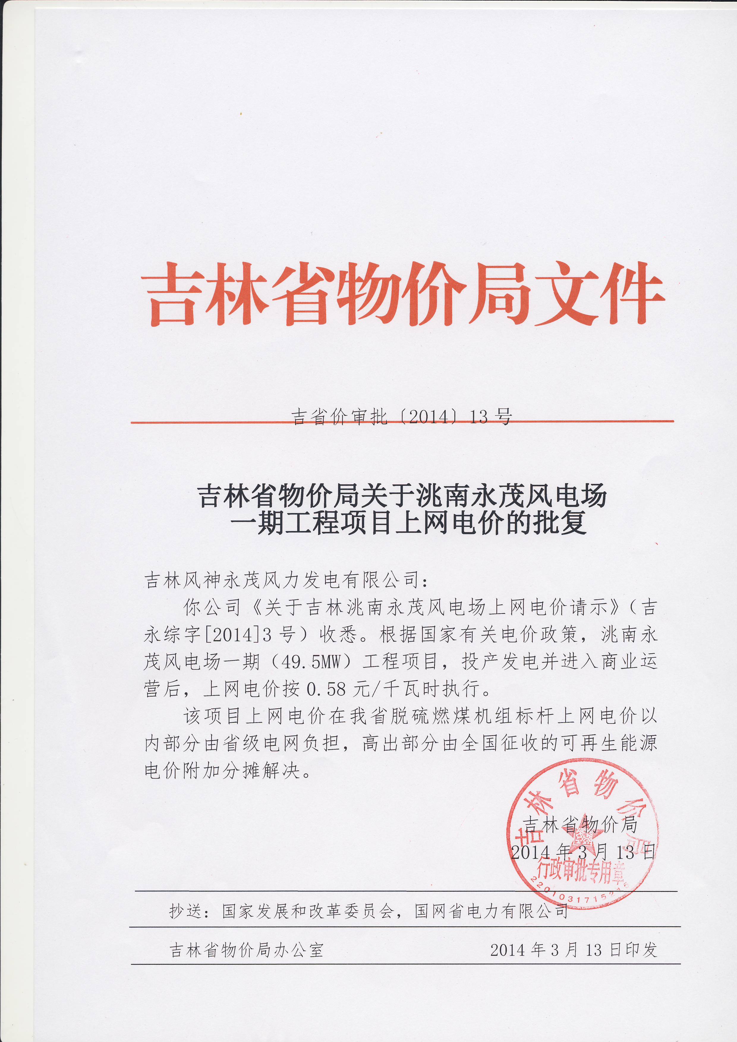 吉林省物价局关于洮南永茂风能电场一期工程项目上网电价的批复