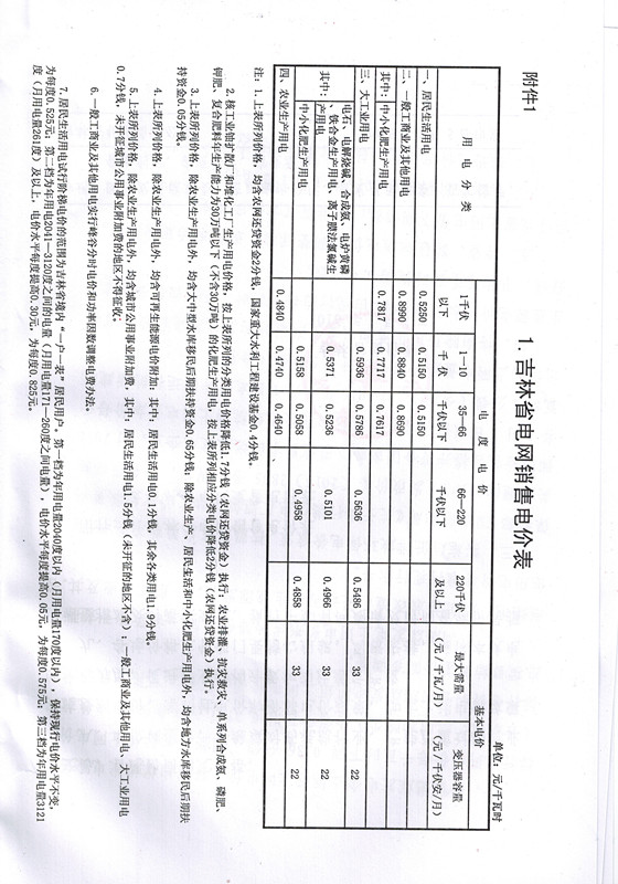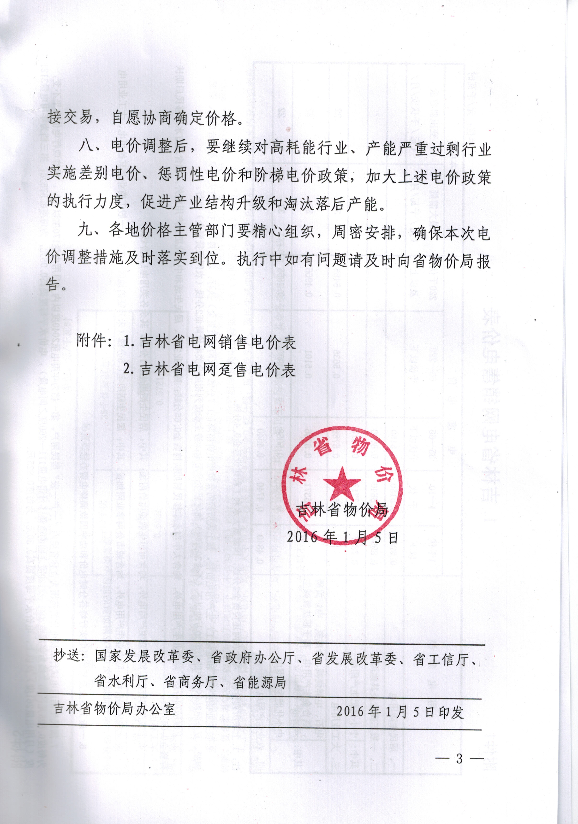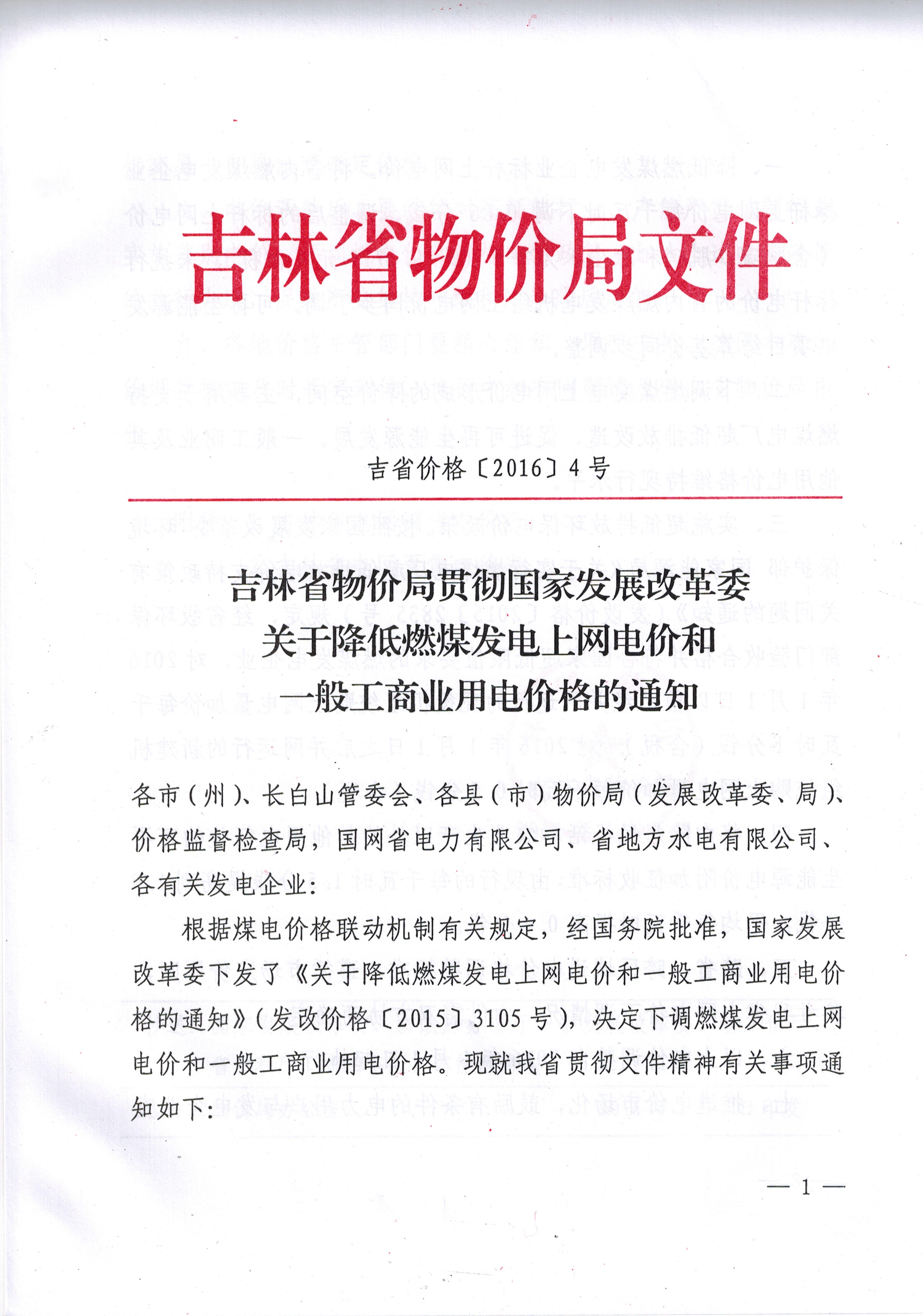 吉林省物价局贯彻国家发展改革委关于降低燃煤发电上网电价和一般工商业用电价格的通知