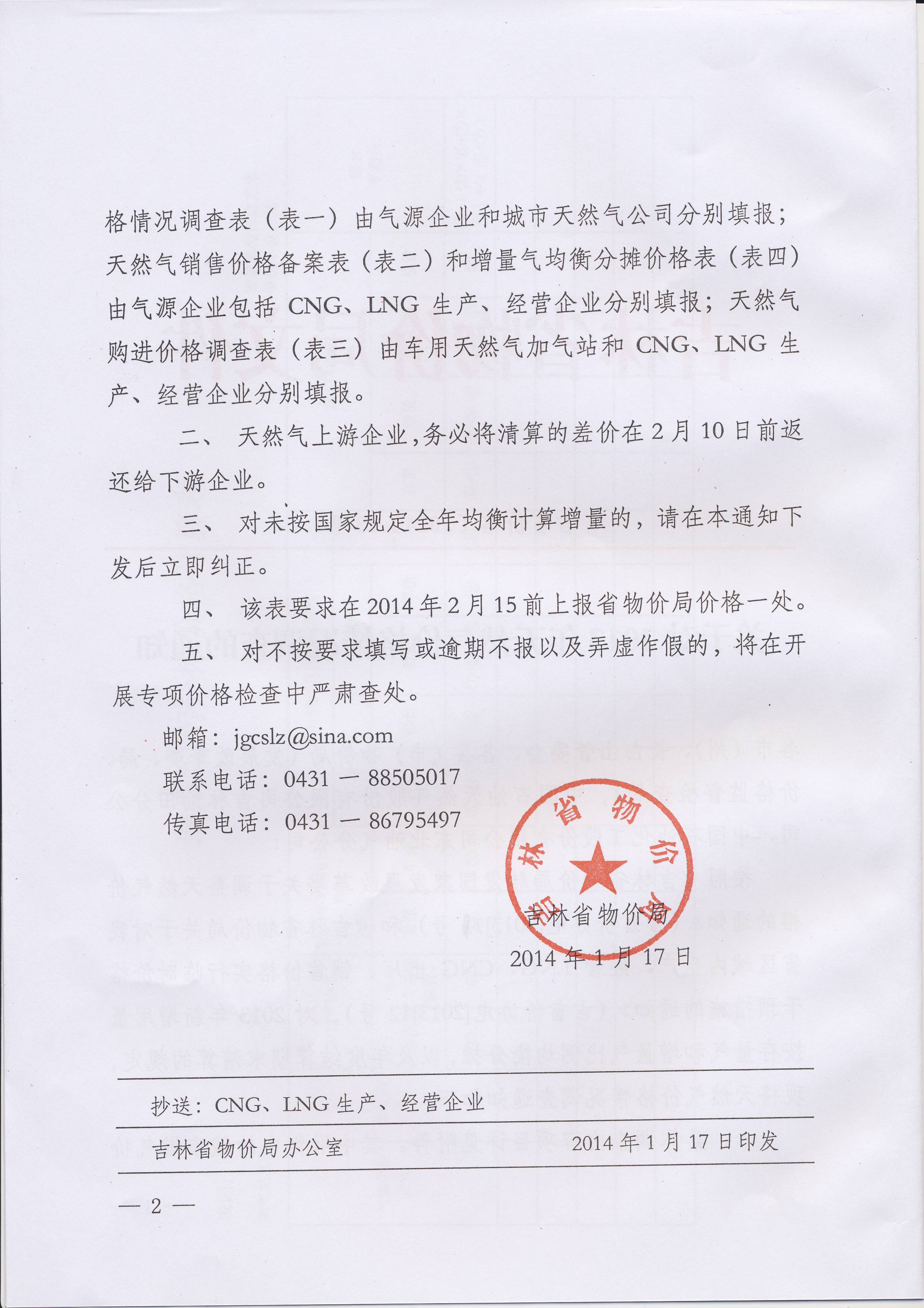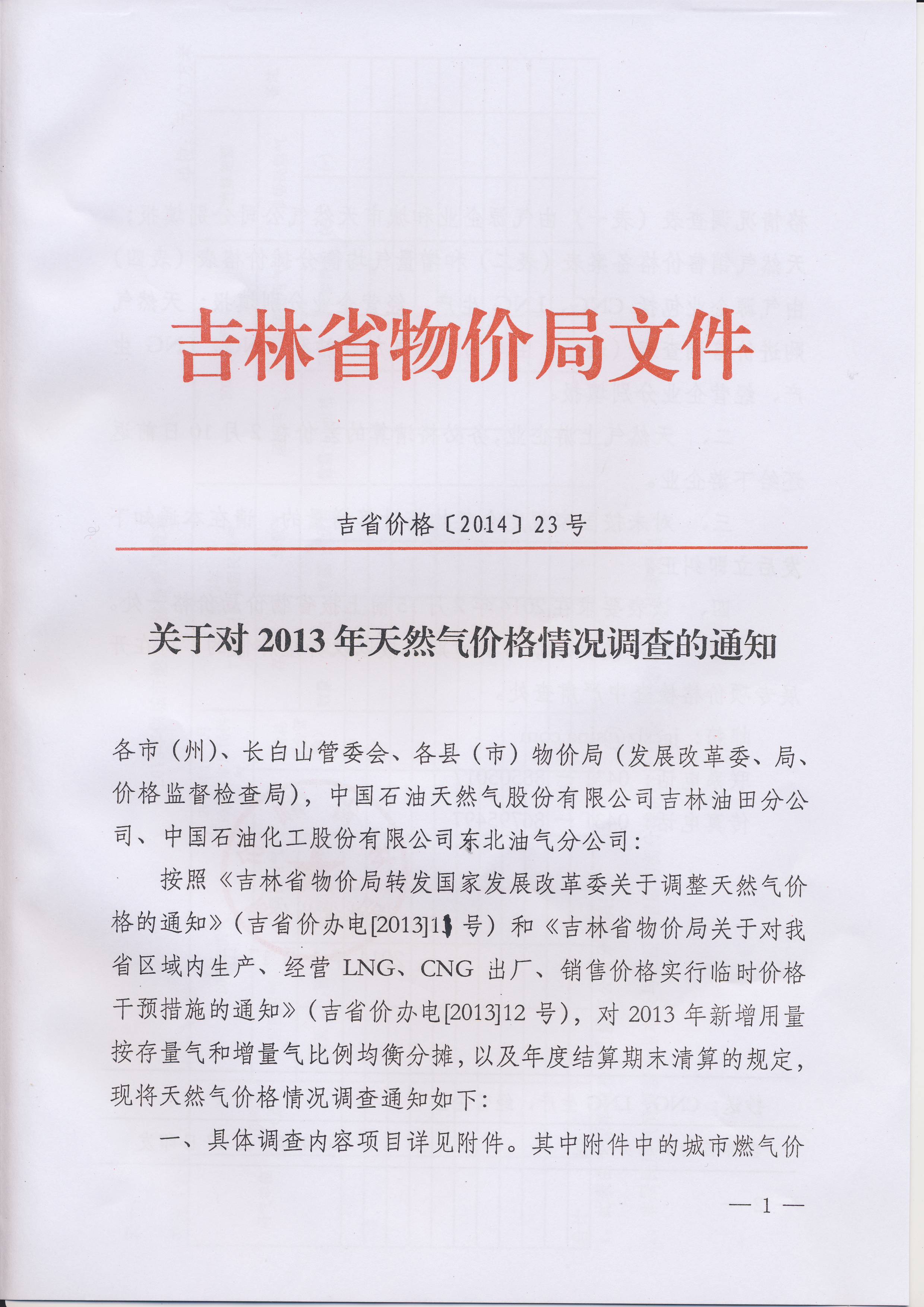 吉林省物价局关于对2013年天然气价格情况调查的通知