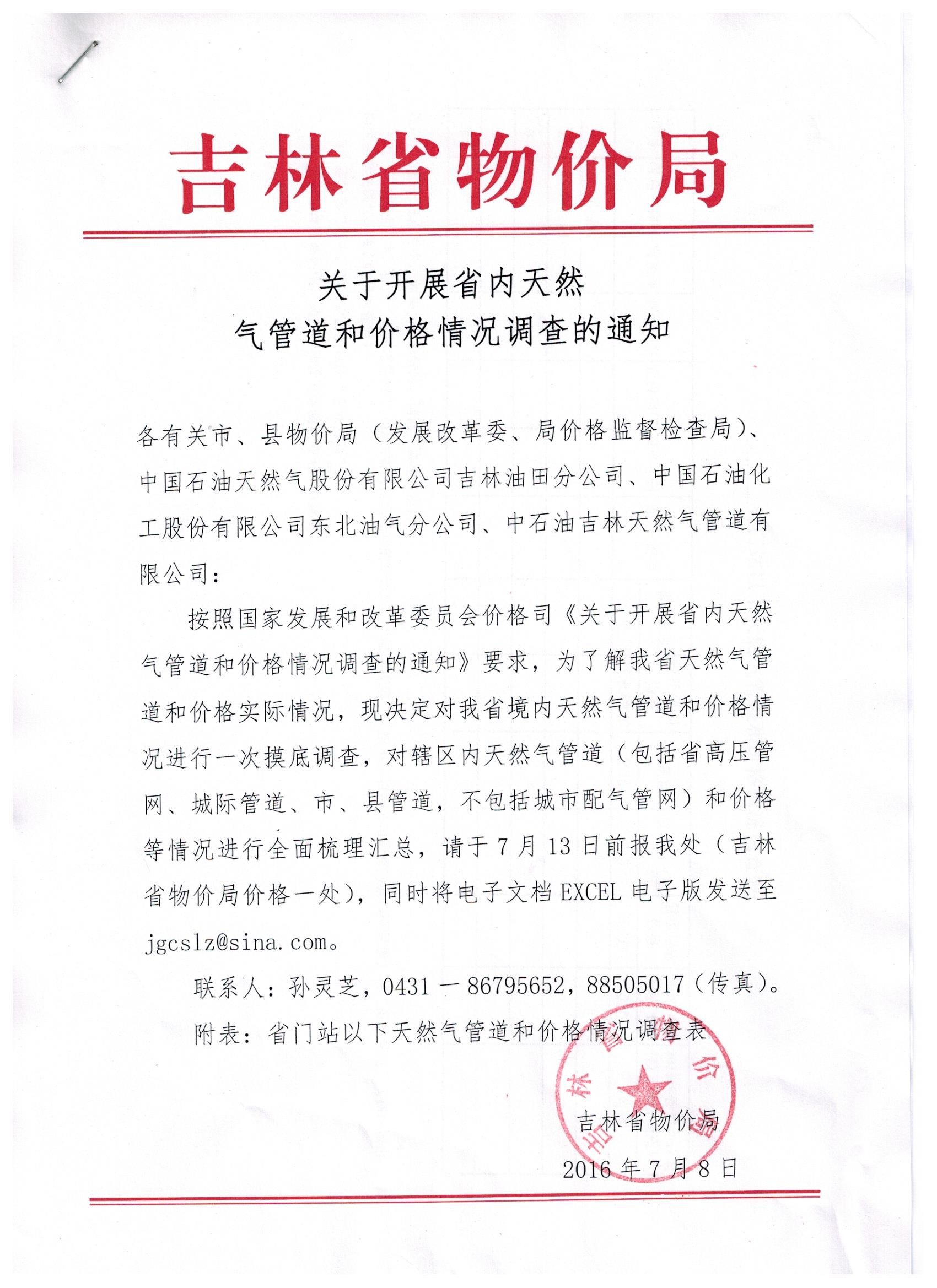 关于开展省内天然气管道和价格情况调查的通知