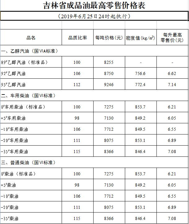 国内成品油价格按机制调整(2019年6月25日24时起执行)