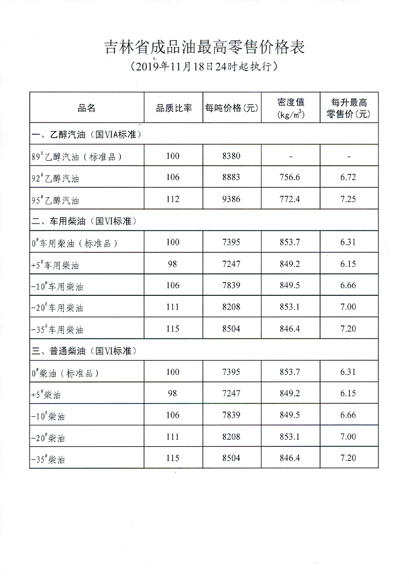 国内成品油价格按机制调整(2019年11月18日24时起执行)
