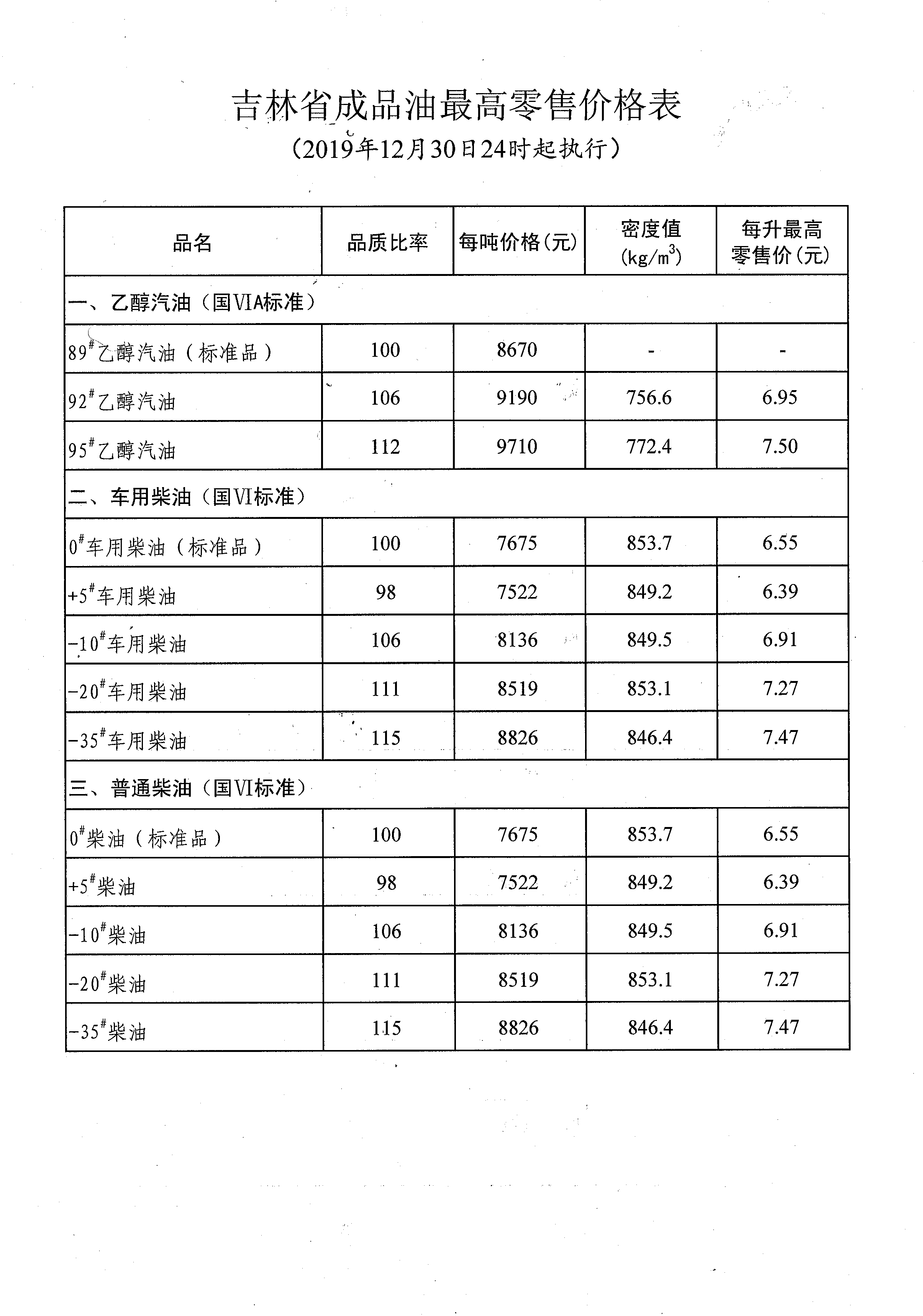 国内成品油价格按机制调整(2019年12月30日24时起执行)